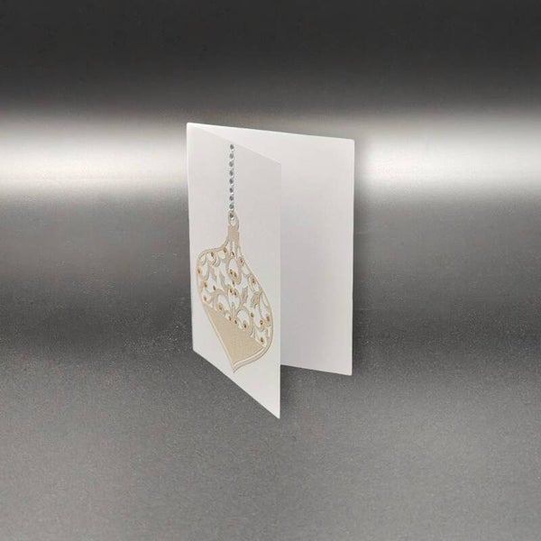 Verleihe deinen Weihnachtsgrüssen eine edle und festliche Note mit dieser eleganten Weihnachtskarte. Die Karte zeigt ein kunstvoll gestaltetes Ornament in zarten Gold- und Cremetönen, das durch filigrane Ausstanzungen und liebevoll platzierte Perlendetails besonders stilvoll wirkt. Die Ornamentform hängt an einer schimmernden Perlenkette und bringt die festliche Atmosphäre perfekt zur Geltung. Diese Karte eignet sich ideal, um stilvolle Weihnachtsgrüsse an Familie, Freunde oder Geschäftspartner zu senden.