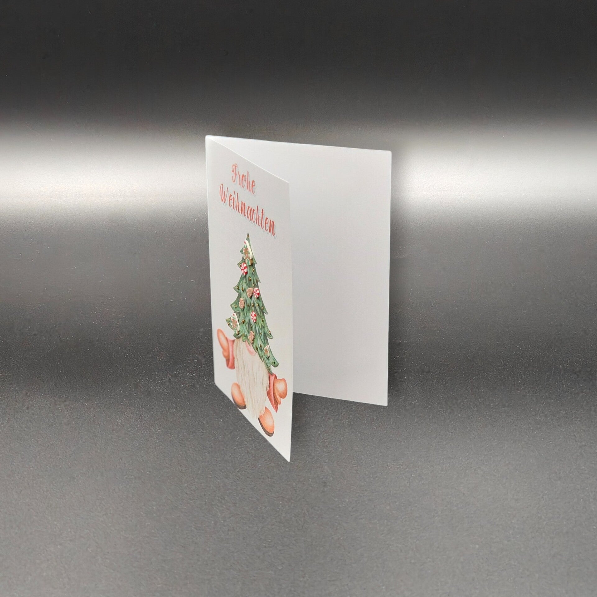 Diese fröhliche Weihnachtskarte zeigt einen niedlichen Gnom, der sich als festlicher Tannenbaum verkleidet hat und "Frohe Weihnachten" wünscht. Mit seiner lustigen Erscheinung, den kleinen Zuckerstangen- und Sternendetails im Tannenbaum und dem liebevoll gestalteten Schriftzug ist diese Karte perfekt, um deinen Liebsten auf humorvolle Weise eine frohe Weihnachtszeit zu wünschen. Der Gnom strahlt Wärme und Gemütlichkeit aus – ideal für Freunde, Familie oder als Beilage zu einem Geschenk.