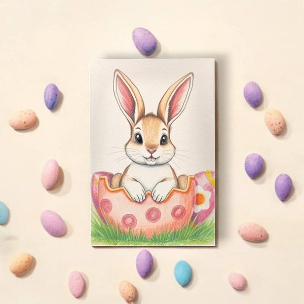 Dieser süsse Hase bringt mit seinen grossen, neugierigen Augen und den spitzen Ohren jede Menge Charme mit. In einer bunt bemalten Eierschale sitzend, ist er die perfekte Begleitung für Ostergrüsse. Der liebevoll gestaltete Hintergrund mit Gras und fröhlichen Farben verleiht der Karte eine verspielte Leichtigkeit, die garantiert ein Lächeln zaubert.